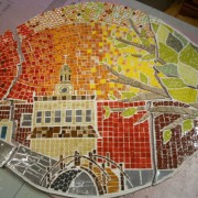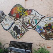 The result is the large, six panel mural now located just off Geneva’s Third Street in the alley across from the courthouse. The mural was dedicated on June 6 in a celebration attended officials from the City and community organizations, FVJN families and friends, and Geneva residents and business owners. The mural was designed by artist Danielle Dobies and based on drawings by children from FVJN’s Sunday School and ideas from FVJN members. FVJN families and friends volunteered countless hours to assemble the mosaic tiles under the artist’s direction. Area businesses and individuals donated some of the materials. Funding to cover other costs was obtained through a grant from the Geneva Foundation for the Arts as well as donations from other FVJN supporters. The mural took over a year to complete.